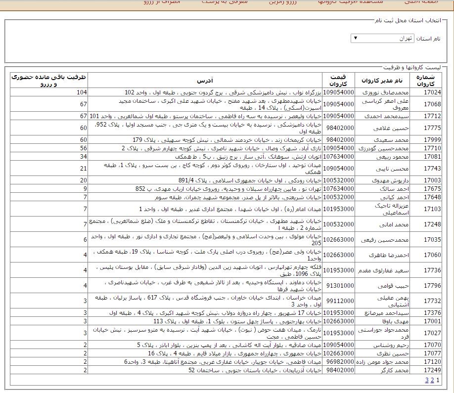 مثال : در منوی مشاهده ظرفیت کاروانها زائر میتواند با کلیک بر روی این منو و انتخاب استان محل سکونت کلیه کاروانهایی که درآن استان یا شهر و دارای ظرفیت میباشند را بهمراه آدرس دفاتر زیارتی مشاهده نماید مانند صفحه زیر: