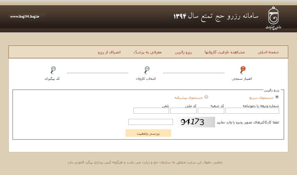 همانطور که در تصویر زیر مشاهده مینمائید در این صفحه زائر میتواند از دو طریق جستجوی سریع و پیشرفته با وارد نمودن اطلاعات خواسته شده اقدام نماید