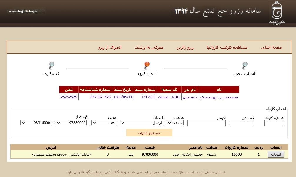 با توجه به اطلاعاتی که در این صفحه مشاهده مینمایید زائر میتواند با توجه به اطلاعات ارائه شده در این صفحه از قبیل آدرس و مبلغ هزینه سفر کاروان وتعداد جای خالی موجود حاضر در کاروان مورد نظر را مشاهده نماید